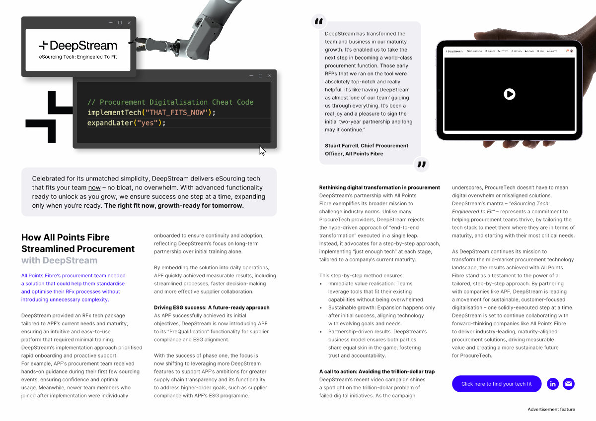 As DeepStream continues its mission to transform the mid-market procurement technology landscape, the results achieved with All Points Fibre stand as a testament to the power of a tailored, step-by-step approach. By partnering with companies like APF, DeepStream is leading a movement for sustainable, customer-focused digitalisation – one solidly-executed step at a time. DeepStream is set to continue collaborating with forward-thinking companies like All Points Fibre to deliver industry-leading, maturity-aligned procurement solutions, driving measurable value and creating a more sustainable future for ProcureTech.
