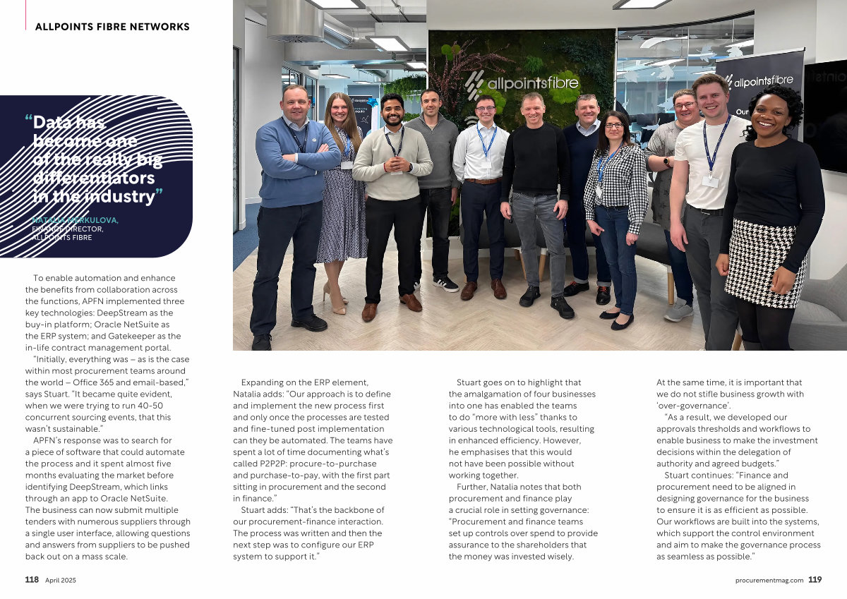 APFN’ s response was to search for a piece of software that could automate the process and it spent almost five months evaluating the market before identifying DeepStream, which links through an app to Oracle NetSuite. The business can now submit multiple tenders with numerous suppliers through a single user interface, allowing questions and answers from suppliers to be pushed back out on a mass scale.