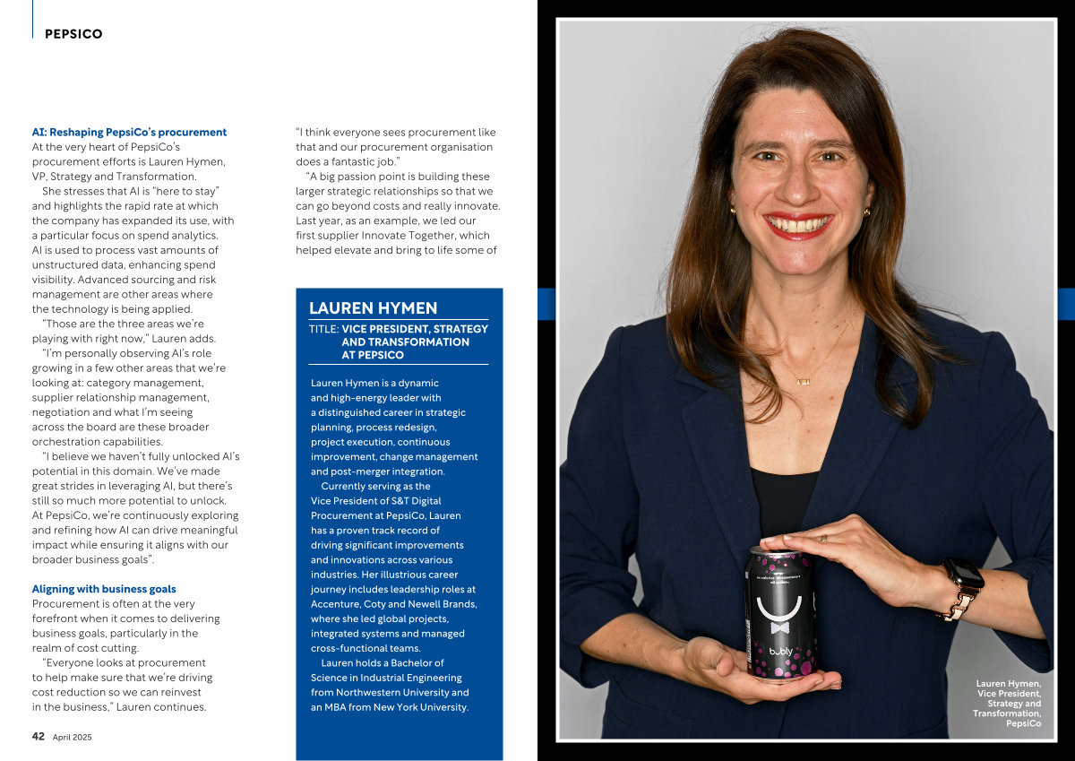 AI: Reshaping PepsiCo’ s procurement At the very heart of PepsiCo’ s procurement efforts is Lauren Hymen, VP, Strategy and Transformation.