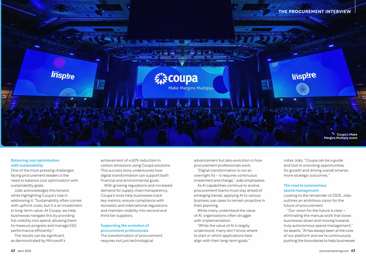 João acknowledges this tension while highlighting Coupa’ s role in addressing it:“ Sustainability often comes with upfront costs, but it is an investment in long-term value. At Coupa, we help businesses navigate this by providing full visibility into spend, allowing them to measure progress and manage ESG performance efficiently.”