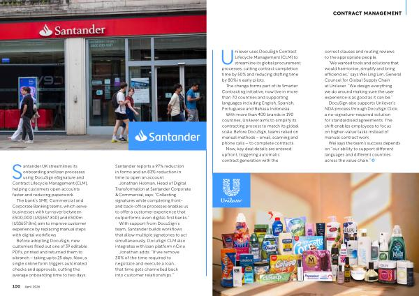Unilever uses DocuSign Contract Lifecycle Management( CLM) to streamline its global procurement processes, cutting contract completion time by 50 % and reducing drafting time by 80 % in early pilots.