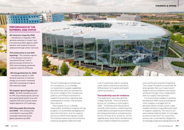That supplier focus is already measurable. AstraZeneca reports strong progress on sustainable packaging and fleet electrification, and its supplier disclosure efforts have rapidly scaled. Procurement teams now track emissions intensity alongside traditional total