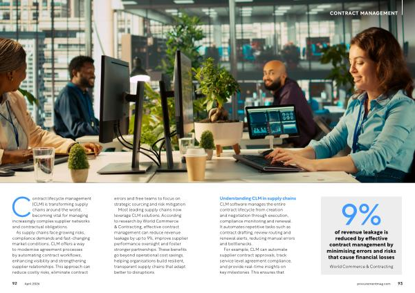 As supply chains face growing risks, compliance demands and fast-changing market conditions, CLM offers a way to modernise agreement processes by automating contract workflows, enhancing visibility and strengthening supplier relationships. This approach can reduce costly risks, eliminate contract errors and free teams to focus on strategic sourcing and risk mitigation.