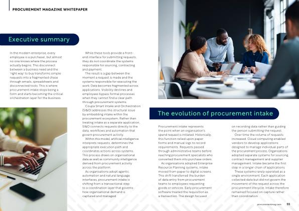 Procurement intake represents the point when an organisation ' s spend request is initiated. Historically, this function relied upon paper forms and manual logs to record requirements. Requests passed through administrative teams before reaching procurement specialists who converted them into purchase orders.