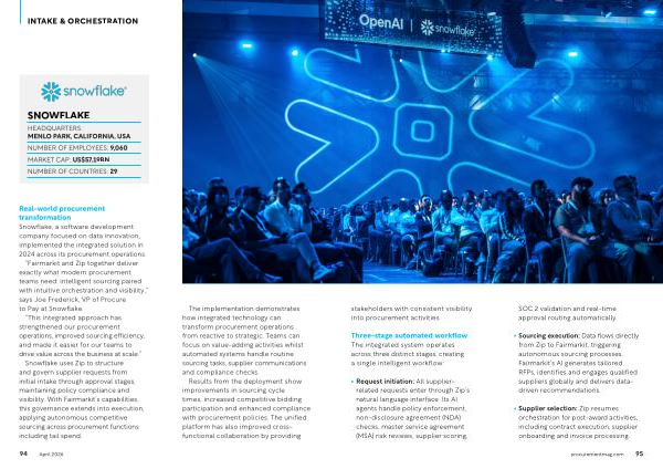 Real-world procurement transformation Snowflake, a software development company focused on data innovation, implemented the integrated solution in 2024 across its procurement operations.