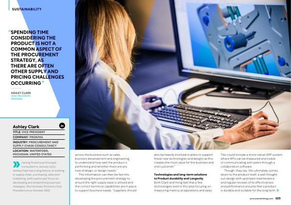 Joining Proxima as Principal Consultant in January 2022 , Ashley Clark has a long history of working in supply chain , purchasing , sales and marketing , with a particular focus on developing and streamlining business strategies . She has been Proxima ’ s Vice President since October 2022 . across the business such as sales , business development and engineering , to understand how well the product is performing and whether there are any new strategic or design needs .”