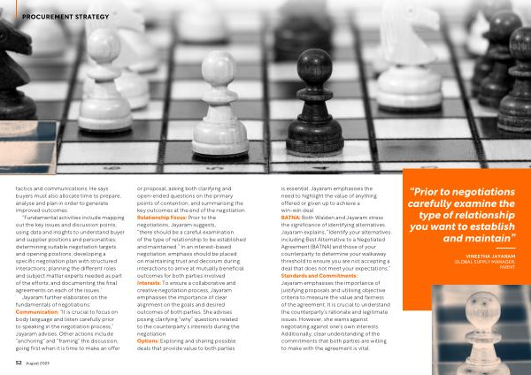 is essential . Jayaram emphasises the need to highlight the value of anything offered or given up to achieve a win-win deal . BATNA : Both Walden and Jayaram stress the significance of identifying alternatives . Jayaram explains , “ Identify your alternatives including Best Alternative to a Negotiated Agreement ( BATNA ) and those of your counterparty to determine your walkaway threshold to ensure you are not accepting a deal that does not meet your expectations .” Standards and Commitments : Jayaram emphasises the importance of justifying proposals and utilising objective criteria to measure the value and fairness of the agreement . It is crucial to understand the counterparty ’ s rationale and legitimate issues . However , she warns against negotiating against one ’ s own interests . Additionally , clear understanding of the commitments that both parties are willing to make with the agreement is vital .