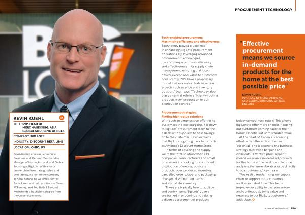 Kevin Kuehl serves as Senior Vice President and General Merchandise Manager of Home , Apparel , and Global Sourcing at Big Lots . With a focus on merchandise strategy , sales , and profitability , he joined the company in 2014 . Before , he was President of Baltic Linen and held positions at Sears , JCPenney , and Bed Bath & Beyond . Kevin holds a bachelor ’ s degree from the University of Iowa .