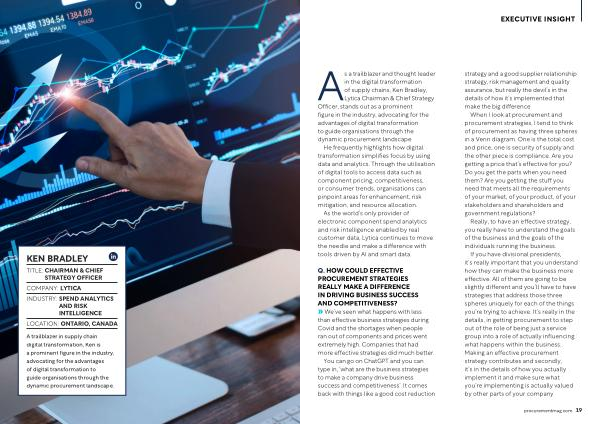 As a trailblazer and thought leader in the digital transformation of supply chains , Ken Bradley , Lytica Chairman & Chief Strategy Officer , stands out as a prominent figure in the industry , advocating for the advantages of digital transformation to guide organisations through the dynamic procurement landscape .