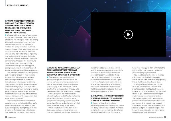 » We deal with a number of companies at Lytica and we were able to see which ones have our strategies for better pricing . We ’ re able to see which ones ran into problems with supply . It seemed to me that the companies that had really thought through their business processes and had those in place in an effective way not only did better on pricing during that period of time , but also did better on the risk side of it and were able to get components . Probably the paramount thing that got the more successful companies through was having good , strong supplier relationships and good strong supplier relationship management .