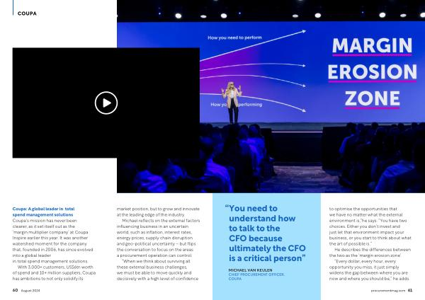 MICHAEL VAN KEULEN CHIEF PROCUREMENT OFFICER , COUPA to optimise the opportunities that we have no matter what the external environment is ,” he says . “ You have two choices . Either you don ’ t invest and just let that environment impact your business , or you start to think about what the art of possible is .”