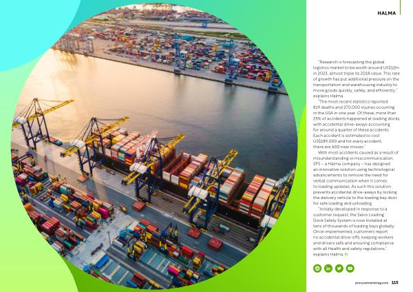 “ Initially developed in response to a customer request , the Salvo Loading Dock Safety System is now installed at tens of thousands of loading bays globally . Once implemented , customers report no accidental drive-offs , keeping workers and drivers safe and ensuring compliance with all Health and safety regulations ,” explains Halma . procurementmag . com 115