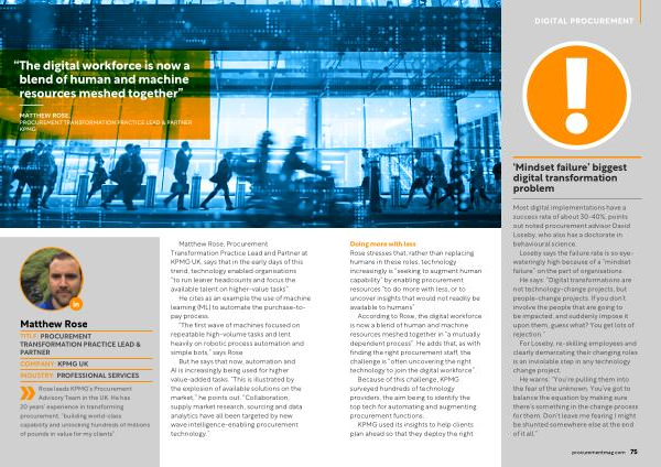 According to Rose , the digital workforce is now a blend of human and machine resources meshed together in “ a mutually dependent process ”. He adds that , as with finding the right procurement staff , the challenge is “ often uncovering the right technology to join the digital workforce ”.
