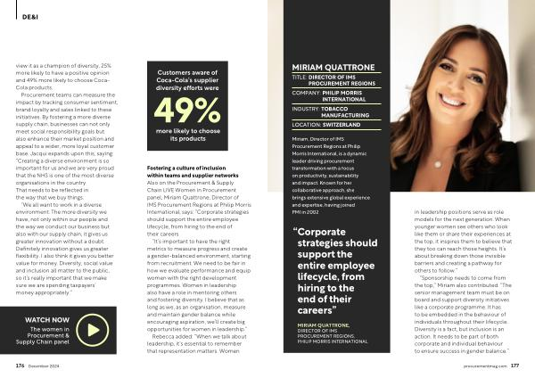 MIRIAM QUATTRONE , DIRECTOR OF IMS PROCUREMENT REGIONS , PHILIP MORRIS INTERNATIONAL in leadership positions serve as role models for the next generation . When younger women see others who look like them or share their experiences at the top , it inspires them to believe that they too can reach those heights . It ’ s about breaking down those invisible barriers and creating a pathway for others to follow .”