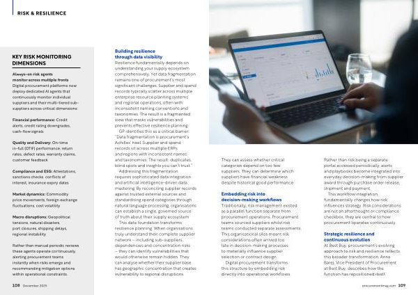 Strategic resilience and continuous evolution At Best Buy, procurement’ s evolving approach to risk and resilience reflects this broader transformation. Anna Barej, Vice President of Procurement at Best Buy, describes how the function has repositioned itself:
