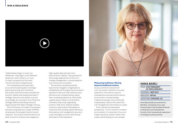 Measuring resilience: Moving beyond traditional metrics As procurement evolves from cost-focused to resilience-focused operations, the metrics used to evaluate procurement performance must evolve correspondingly. Traditional savings-only scorecards inadequately capture the value that risk management and resilience create.