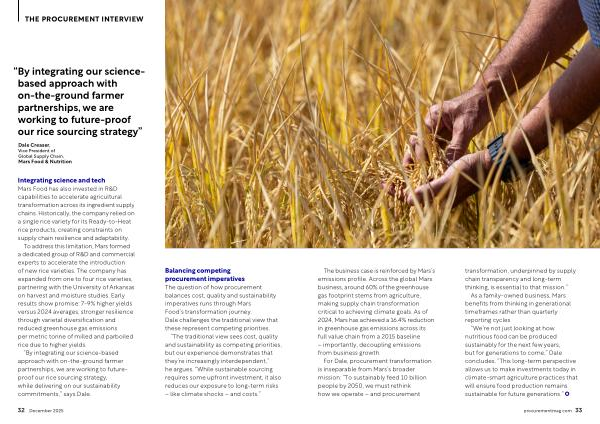 For Dale, procurement transformation is inseparable from Mars’ s broader mission:“ To sustainably feed 10 billion people by 2050, we must rethink how we operate – and procurement transformation, underpinned by supply chain transparency and long-term thinking, is essential to that mission.”