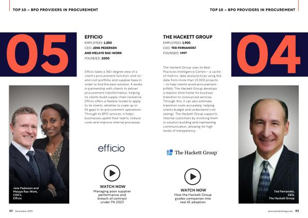 takes a 360-degree view of a client’ s procurement function, end-toend cost portfolio and supplier base in order to find the best solution. It works in partnership with clients to deliver procurement transformation, helping its clients build supply chain resilience. Efficio offers a flexible model to apply to its clients, whether to scale up or fill gaps in its procurement operations. Through its BPO services, it helps businesses upskill their teams, reduce costs and improve internal processes. Jens Pedersen and Melaye Ras-Work, CEO’ s, Efficio