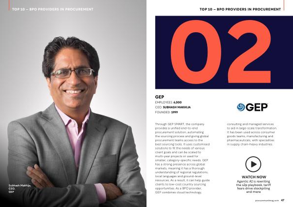 Through GEP SMART, the company provides a unified end-to-end procurement solution, automating the sourcing process and giving global procurement teams access to the best sourcing tools. It uses customised solutions to fit the needs of various client goals and can be scaled to multi-year projects or used for smaller, category-specific needs. GEP has a strong presence across global markets, meaning it has a thorough understanding of regional regulations, local languages and ground-level resources. As a result, it can help guide clients to low-cost country sourcing opportunities. As a BPO provider, GEP combines cloud technology, consulting and managed services to aid in large-scale transformation. It has been used across consumer goods teams, manufacturing and pharmaceuticals, with specialities in supply chain-heavy industries. WATCH NOW
