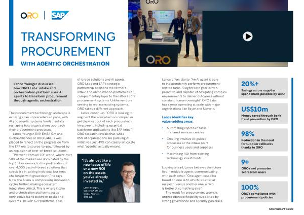 Lance offers clarity:“ An AI agent is able to independently perform procurementrelated tasks. AI agents are goal-driven, proactive and capable of navigating complex environments to deliver outcomes without constant human oversight.” ORO Labs has agents operating at scale with major organisations like Bayer and Novartis.