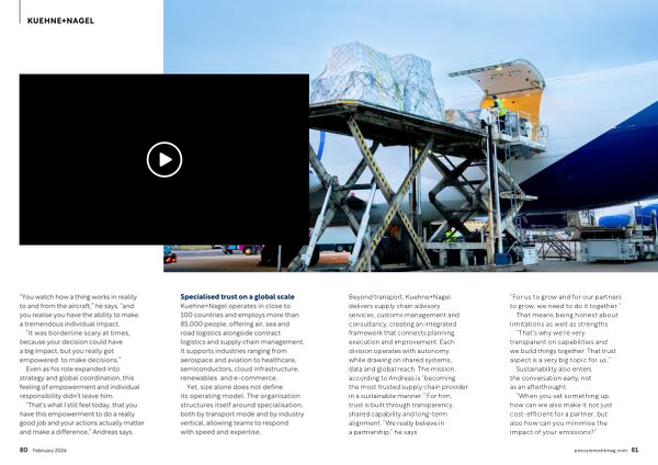 Specialised trust on a global scale Kuehne + Nagel operates in close to 100 countries and employs more than 85,000 people, offering air, sea and road logistics alongside contract logistics and supply chain management. It supports industries ranging from aerospace and aviation to healthcare, semiconductors, cloud infrastructure, renewables and e-commerce.