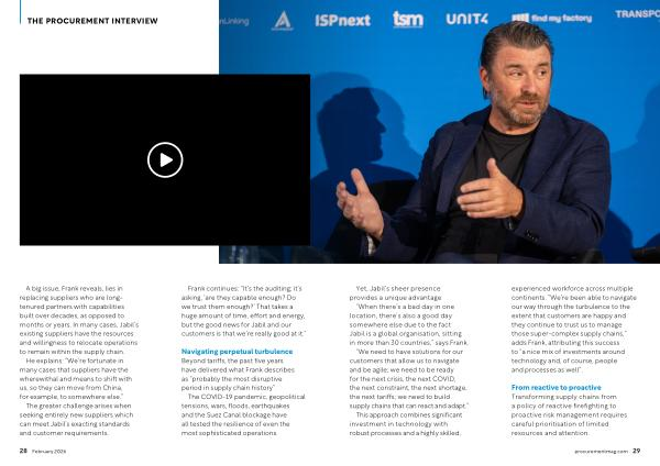 Frank continues:“ It’ s the auditing; it’ s asking,‘ are they capable enough? Do we trust them enough?’ That takes a huge amount of time, effort and energy, but the good news for Jabil and our customers is that we’ re really good at it.”