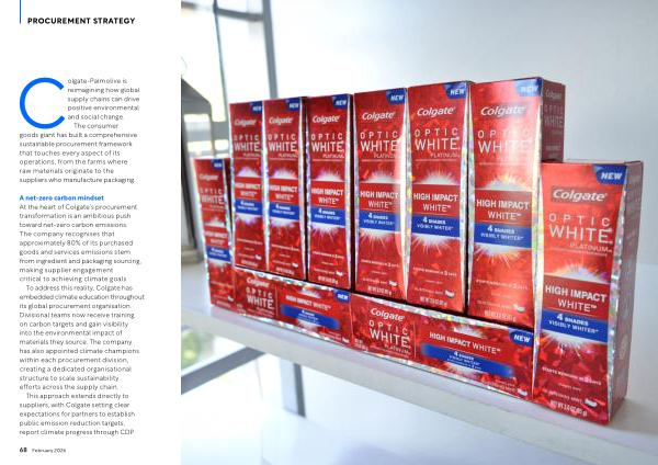 A net-zero carbon mindset At the heart of Colgate’ s procurement transformation is an ambitious push toward net-zero carbon emissions. The company recognises that approximately 80 % of its purchased goods and services emissions stem from ingredient and packaging sourcing, making supplier engagement critical to achieving climate goals.