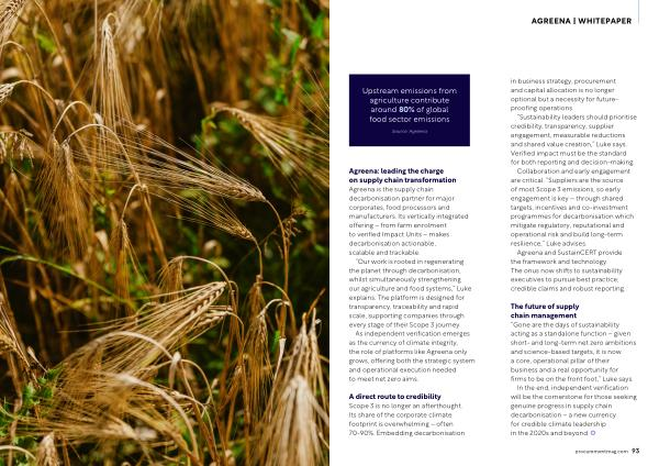 Agreena: leading the charge on supply chain transformation Agreena is the supply chain decarbonisation partner for major corporates, food processors and manufacturers. Its vertically integrated offering – from farm enrolment to verified Impact Units – makes decarbonisation actionable, scalable and trackable.