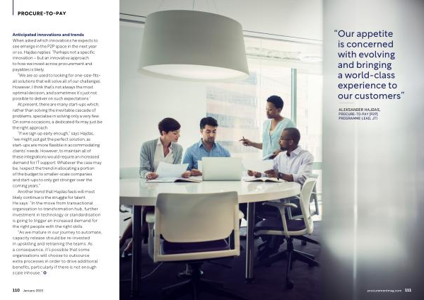 Anticipated innovations and trends When asked which innovations he expects to see emerge in the P2P space in the next year or so , Hajdas replies : “ Perhaps not a specific innovation – but an innovative approach to how we invest across procurement and payables is likely .