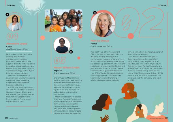 In 2020 , she was honoured as one of B2Gs ‘ 100 Most Influential Women in Supply Chain ’, and she received the highly-coveted Procurement Leader Award from the World Procurement Organisation in 2017 .