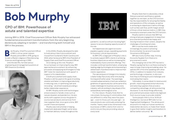 As IBM CPO , a large part of Murphy ’ s role is to actively support IBM ’ s clients in achieving business objectives as well as increasing the marketability of procurement offerings . This includes continual transformation , employing leading edge technologies and empowering a skilled team of professionals to improve their clients ’ experience .