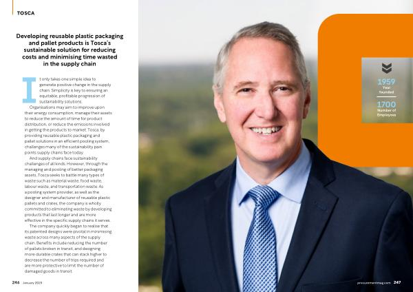 Developing reusable plastic packaging and pallet products is Tosca ’ s sustainable solution for reducing costs and minimising time wasted in the supply chain