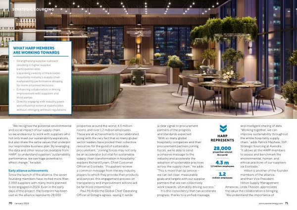 1.2 million employees and intelligent sharing of data . “ Working together , we can improve sustainability throughout the entire hospitality supply chain ,” adds Patrick Mayhew , SVP , Strategic Sourcing at Avendra . “ It allows all the HARP members to assess and benchmark the environmental , human , and ethical practices of our suppliers via EcoVadis .”