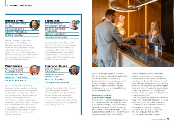 Procurement acting as a key driver for change The environmental impacts of procurement and supply operations are integral for the sustainability strategies of all the founding hospitality members . It is for this reason procurement is absolutely integral to the success of the wider business environmental strategy . Caroline Tissot , Group Chief