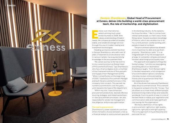 “ My career journey so far has led me to my current position as Global Head of Procurement at Exness ,” says Zhantilessov , who has a finance degree and is a member of the Chartered Institute of Procurement and Supply Chain Management ( CIPS ). “ When I joined Exness at the beginning of 2020 , I started as a Procurement Manager and built the procurement process in the company from scratch . This earned me numerous promotions over the years , until I became the head of the department .