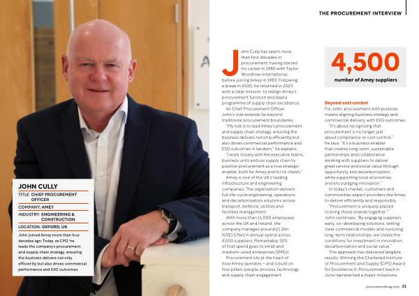 John joined Amey more than four decades ago. Today, as CPO, he leads the company’ s procurement and supply chain strategy, ensuring the business delivers not only efficiently but also drives commercial performance and ESG outcomes.