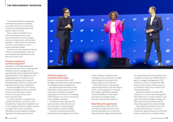 Quantifying the opportunity Looking ahead to 2026, SAP’ s AI innovations target outcomes that extend well beyond cost reduction. Early estimates suggest the potential for substantial productivity gains across multiple functions: up to 60 % efficiency gains in category management, 70 % reduction in time to create RFPs, 85 % faster job description creation and up to 50 % faster execution of search and transactional tasks.
