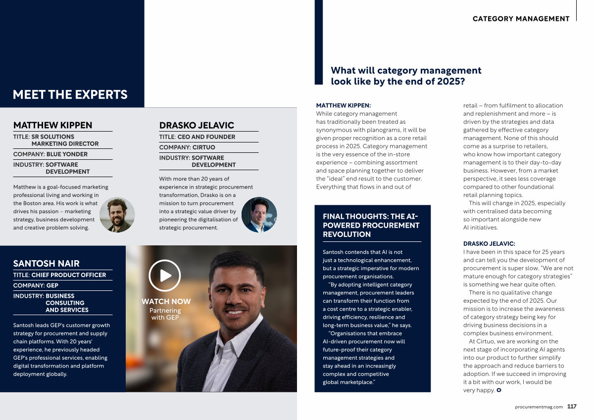 “ Organisations that embrace AI-driven procurement now will future-proof their category management strategies and stay ahead in an increasingly complex and competitive global marketplace .” retail – from fulfilment to allocation and replenishment and more – is driven by the strategies and data gathered by effective category management . None of this should come as a surprise to retailers , who know how important category management is to their day-to-day business . However , from a market perspective , it sees less coverage compared to other foundational retail planning topics .