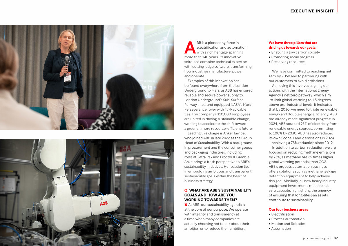 Examples of this innovation can be found everywhere from the London Underground to Mars , as ABB has ensured reliable and secure power supply to London Underground ’ s Sub-Surface Railway lines , and equipped NASA ’ s Mars Perseverance rover with Ty-Rap cable ties . The company ’ s 110,000 employees are united in driving sustainable change , working to accelerate the shift toward a greener , more resource-efficient future . Leading this charge is Anke Hampel , who joined ABB in late 2022 as the Group Head of Sustainability . With a background in procurement and the consumer goods and packaging industries , including roles at Tetra Pak and Procter & Gamble , Anke brings a fresh perspective to ABB ’ s sustainability initiatives . Her passion lies in embedding ambitious and transparent sustainability goals within the heart of business strategy .