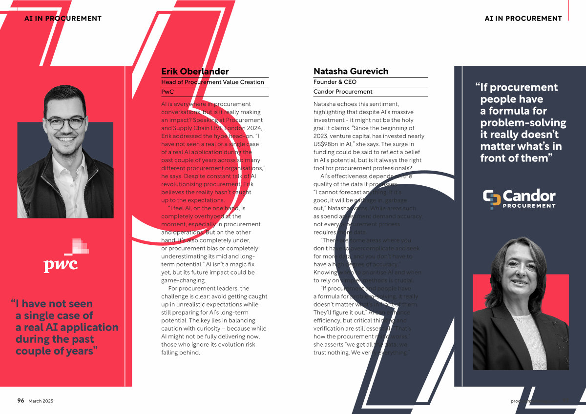 “ I feel AI , on the one hand , is completely overhyped at the moment , especially in procurement and operations . But on the other hand , it ’ s also completely under , or procurement bias or completely underestimating its mid and longterm potential .” AI isn ’ t a magic fix yet , but its future impact could be game-changing .