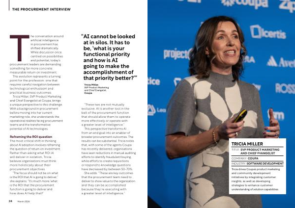 This perspective transforms AI from an end goal into an enabler of broader procurement outcomes. The results can be substantial. Tricia notes that, with some of the agents Coupa has recently delivered, organisations have seen reductions in manual auditing efforts to identify fraudulent buying, while efforts to create requisitions or respond to knowledge questions have decreased by between 50-70 %.