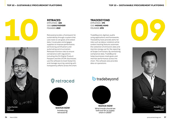 provides a framework for sustainability through a system that uses tools to set goals and collect data. It evaluates and engages suppliers to improve performance, centralising certifications and automating communication. Retraced monitors risks to ensure compliance with regulations including the EU Digital Product Passport and the UFLPA. Businesses use the software to track footprints and manage sourcing, assisting with transparency efforts across the chain. Lukas Puender, CEO, Retraced