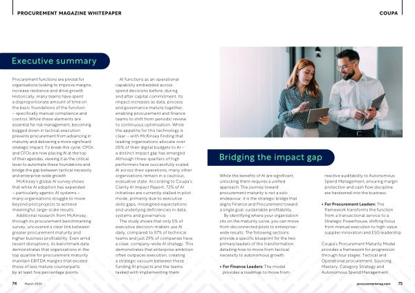 Coupa’ s Procurement Maturity Model provides a framework for progression through four stages: Tactical and Operational procurement, Sourcing Mastery, Category Strategy and Autonomous Spend Management.