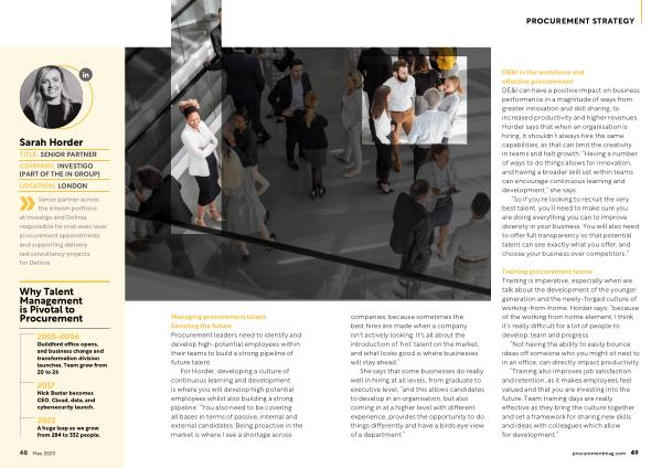Managing procurement talent : Securing the future Procurement leaders need to identify and develop high-potential employees within their teams to build a strong pipeline of future talent .