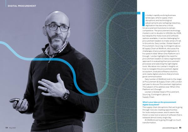 n today ’ s rapidly evolving business landscape , where supply chain disruptions and technological advancements are reshaping industries , digitisation has become critical for procurement functions to remain competitive . The procurement technology market is set to double to US $ 12bn by 2028 , but despite the many tools and software options available , it can be challenging for procurement leaders to make sense of it all . In this article , Gary Levitan , Global Head of Procurement , Sourcing , Contingent Labour , & Supply Chain at WeWork , discusses the challenges of procurement digitisation . In his speech titled ‘ When One Platform isn ’ t Enough ,’ Levitan highlights the need for procurement leaders to take a regimented approach in evaluating their procurement processes and selecting the right digital tools . We delve into Levitan ’ s insights on how to navigate the procurement digital ecosystem , evaluate software solutions , and create digital solutions that promote good communication .