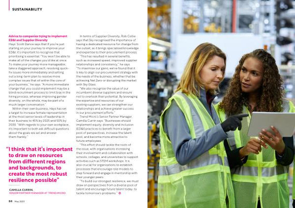 Trend Micro ’ s Senior Partner Manager , Camilla Currin says : “ Businesses should implement equity , diversity and inclusion ( ED & I ) practices to benefit from a larger pool of perspectives , increase the talent pool , and become more attractive to future employees .