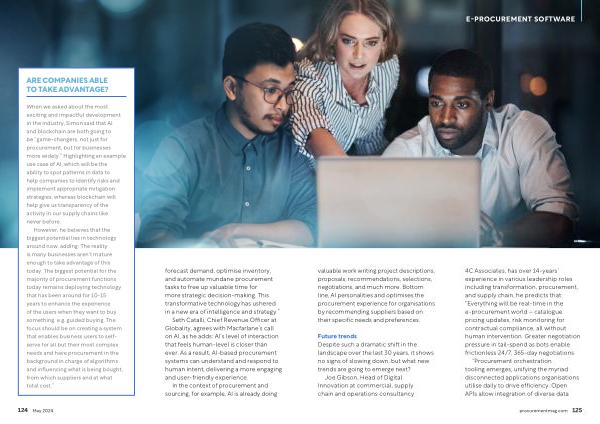 4C Associates , has over 14-years ’ experience in various leadership roles including transformation , procurement , and supply chain , he predicts that : “ Everything will be real-time in the e-procurement world – catalogue pricing updates , risk monitoring for contractual compliance , all without human intervention . Greater negotiation pressure in tail-spend as bots enable frictionless 24 / 7 , 365-day negotiations .