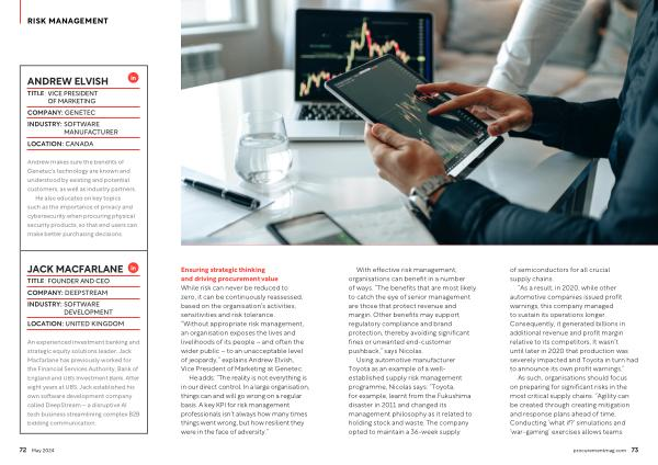 Ensuring strategic thinking and driving procurement value While risk can never be reduced to zero , it can be continuously reassessed , based on the organisation ’ s activities , sensitivities and risk tolerance . “ Without appropriate risk management , an organisation exposes the lives and livelihoods of its people – and often the wider public – to an unacceptable level of jeopardy ,” explains Andrew Elvish , Vice President of Marketing at Genetec .