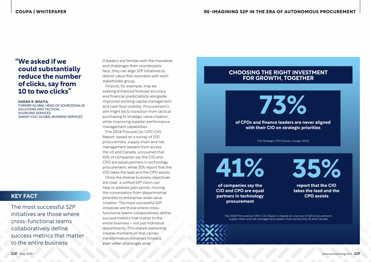 If leaders are familiar with the mandates and challenges their counterparts face, they can align S2P initiatives to deliver value that resonates with each stakeholder group. Finance, for example, may be seeking enhanced forecast accuracy and financial predictability alongside improved working capital management and cash flow visibility. Procurement’ s aim might be to transition from tactical purchasing to strategic value creation, while improving supplier performance management capabilities. The 2024 ProcureCon CPO-CIO Report, based on a survey of 100 procurement, supply chain and risk management leaders from across the US and Canada, uncovered that 41 % of companies say the CIO and CPO are equal partners in technology procurement, while 35 % report that the CIO takes the lead and the CPO assists. Once the diverse business objectives are clear, a unified S2P vision can help to address pain points, moving the conversation from departmental priorities to enterprise-wide value creation. The most successful S2P initiatives are those where crossfunctional teams collaboratively define success metrics that matter to the entire business – not just individual departments. This shared ownership creates momentum that carries transformation initiatives forward, even when challenges arise.