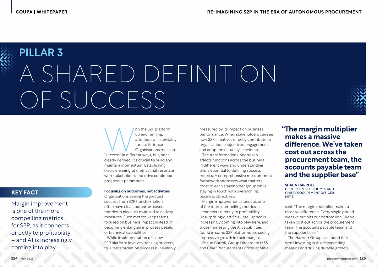 measured by its impact on business performance. When stakeholders can see how S2P initiatives directly contribute to organisational objectives, engagement and adoption naturally accelerate. The transformation undertaken affects functions across the business in different ways and understanding this is essential to defining success metrics. A comprehensive measurement framework addresses what matters most to each stakeholder group while staying in touch with overarching business objectives. Margin improvement stands as one of the more compelling metrics, as it connects directly to profitability. Unsurprisingly, artificial intelligence is increasingly coming into play here, and those harnessing the AI capabilities found in some S2P platforms are seeing impressive growth in their margins. Shaun Carroll, Group Director of MSS and Chief Procurement Officer at Mitie,